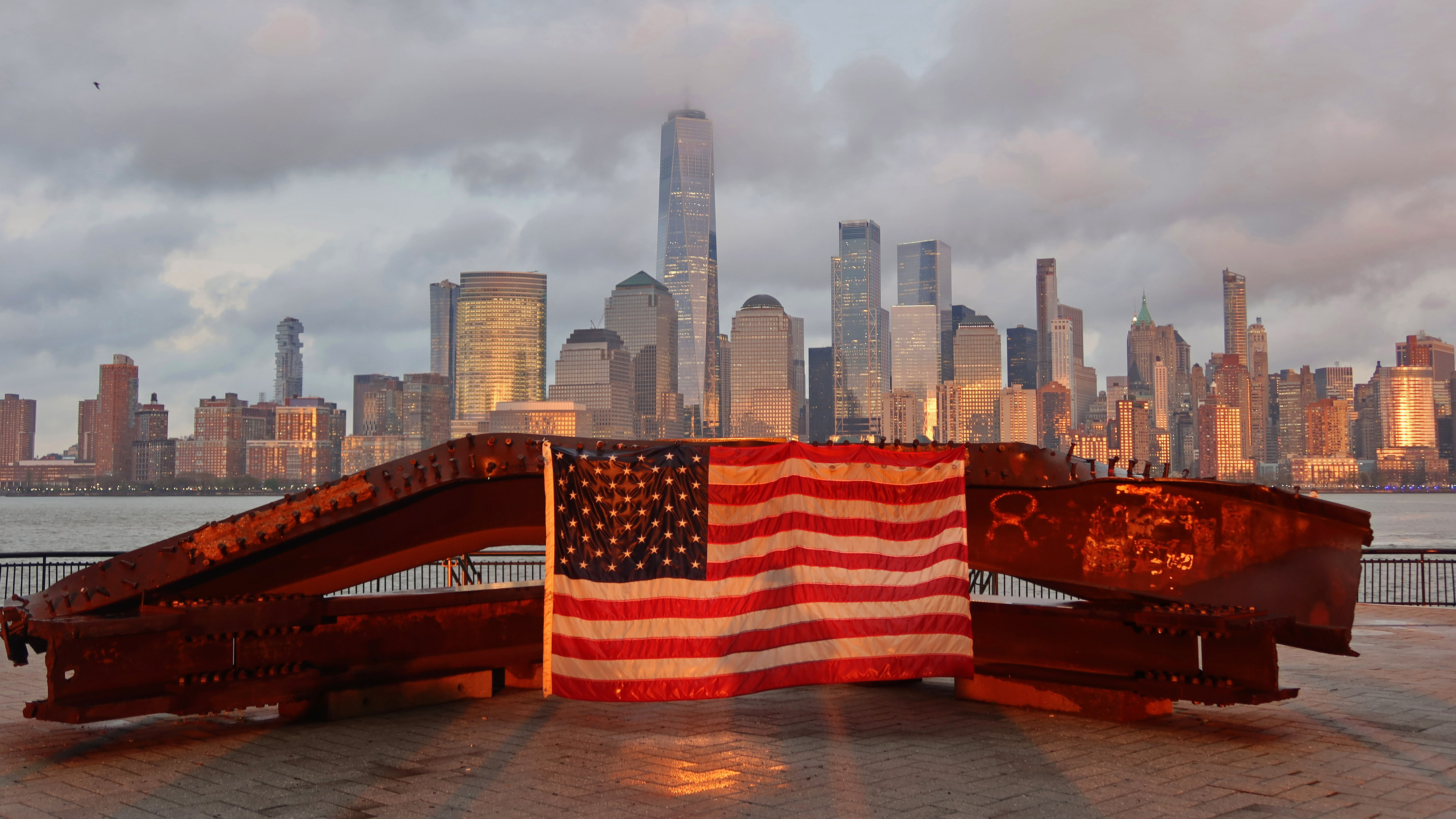 US flag on part of a 9/11 memorial overlooking the New York skyline from Exchange Place